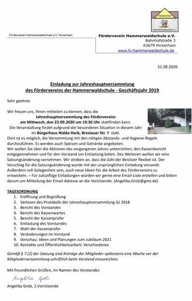 Der Förderverein lädt zur Jahreshauptversammlung ein. Diese findet aufgrund der Corona-Pandemie dieses Jahr im Bürgerhaus Nidda Harb statt. Das Datum ist der 23.09.2020 um 19.30 Uhr. Wir freuen uns auf zahlreiches Erscheinen.