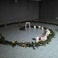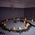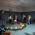 Alle Klassen der Grundstufe trafen sich im Bewegungsraum. Auf dem Boden war aus Tannenzweigen und weiteren Naturmaterialien eine Spirale ausgelegt worden: unser Laternengärtchen.