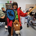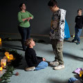 Frau Jakob las die Geschichte von Sankt Martin vor. Sie wurde von Fynn und Jayden unterstützt. Fynn spielte Sankt Martin, der auf einem Pferd mit Schwert und Schild und mit einem roten Mantel ritt. Jayden spielte den Bettler, der vor dem Stadttor saß und um Hilfe bat. Fynn und Jayden spielten nach, wie Sankt Martin seinen warmen Mantel mit dem Schwert in zwei Teile schnitt und einen Teil dem Bettler gab. Nach Ende der Geschichte sangen alle zusammen das Lied von Sankt Martin. Manche Kinder schlüpften im Laufe des Tages auch noch einmal in die besagten Kostüme.